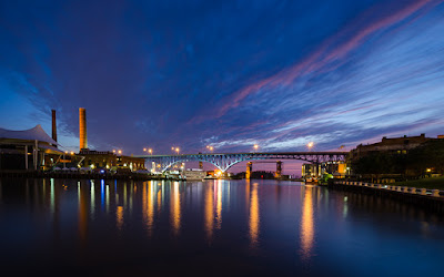 The skies were pretty glum when I arrived at 7 - gruesome Northcoast grey - and as sunset approached, the sun plopped behind a thick bank of clouds, crushing any hopes for lovely color. However, it's Cleveland and you know what they say about the weather - start packing up your tripod, and - BAM! - magic: